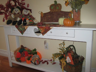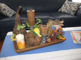 The colors of my home do not “Fall” into the common colors of the season so I have to do a bit of extra creative thinking. I have all white furniture with blue accents in my family room and kitchen and purple and green in my living room/dining area.